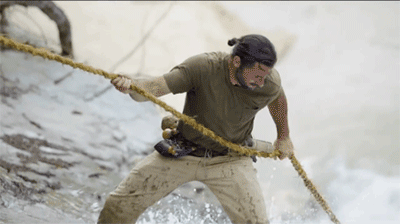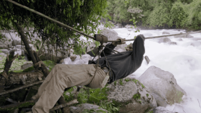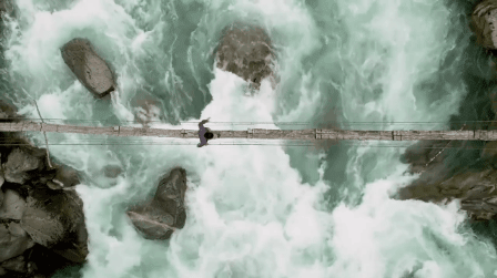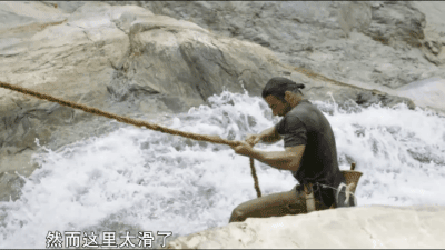 爬到一半,黑森卡在中间,挂在竹绳上动弹不得,几米之下,就是湍急的河流...
