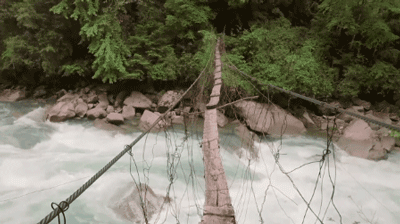 这索桥,用一脚掌宽的木板,头尾衔接而成,然后用几根钢索吊在急流之上,走动起来,桥身就像一条蜿蜒腰摆的长蛇...