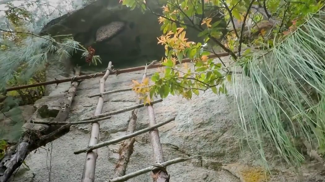 最后,黑森攀上现搭的木梯,在没有任何装备的情况下,徒手取蜂蜜。