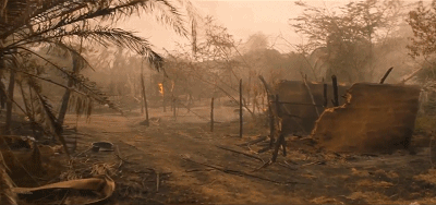 空气里一片灰蒙,烟雾弥漫,树木被烧毁得只剩光秃秃的树干;