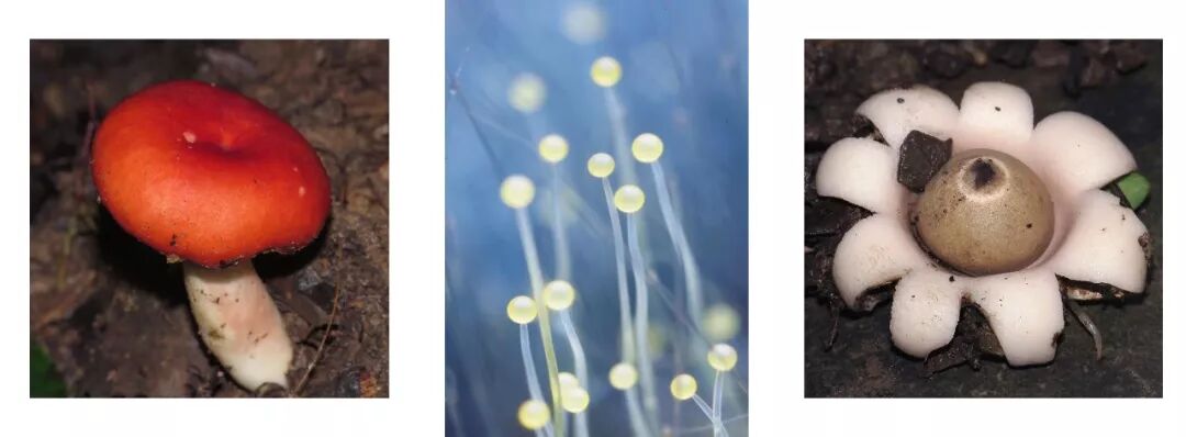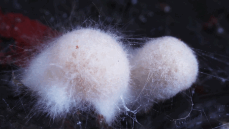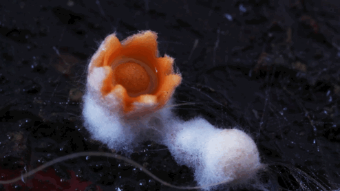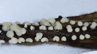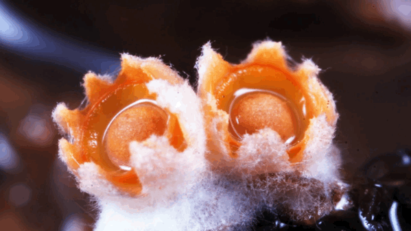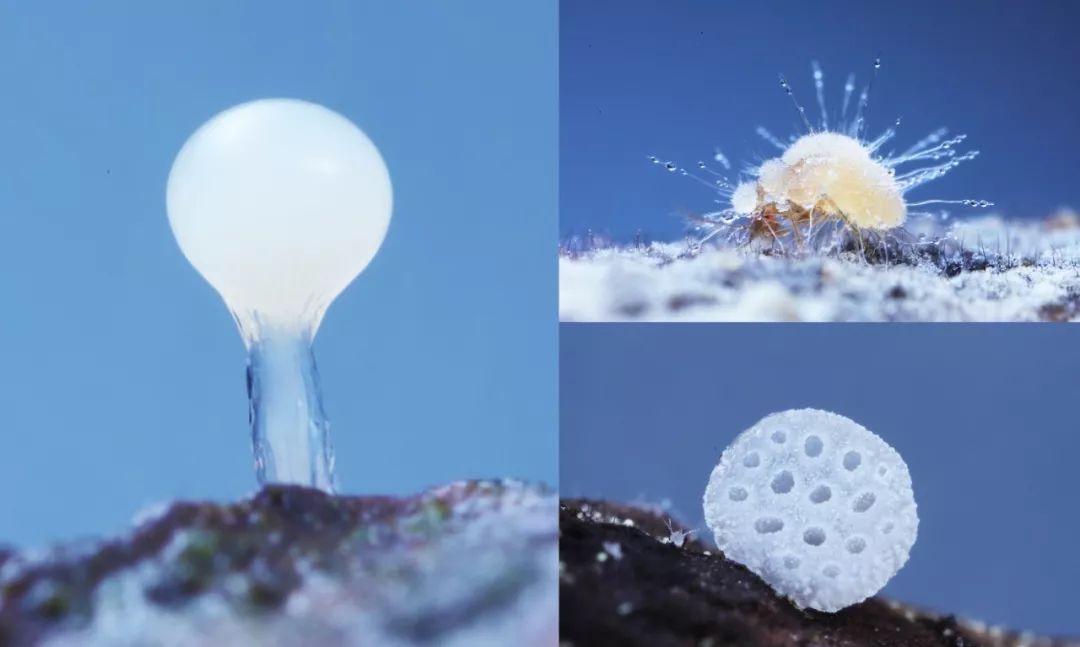 这是另外一种会发射炮弹的真菌,叫做弹球菌。这个白绒绒的就是弹球菌的外包被,它会朝向有阳光的地方,慢慢地裂开,裂成六到八个裂片。它裂开以后,里面圆鼓鼓的,我们看不见的叫做内包被,它会不停地吸水膨胀,然后冲破这个外包被的束缚,把孢子弹走。