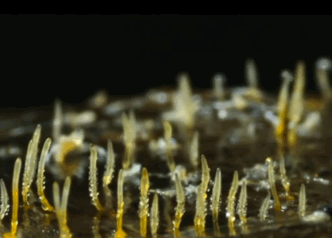 这个透明的像球一样的东西就是刚才说过的孢囊下泡,它会不停地吸水膨胀,然后聚焦光线。光线的焦点恰好就在这个黄色的地方,这是一种感光色素,水玉霉通过这种感光色素来移动自己的身体,把它的黑色的孢子,朝向有阳光的地方喷射。 这是我拍的一小段视频,大家可以观察到,水玉霉会有一个移动身体寻找阳光的动作。黑的就是逐渐变成熟的孢子囊,孢囊下泡慢慢变鼓,它们俩的方向都一样,都在寻找阳光。