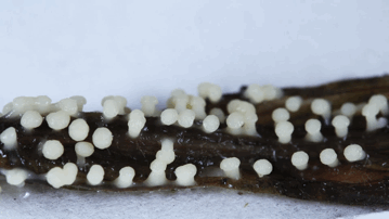 注意看,它只要不动了就是马上要变色了。它最后还会变白,就是彻底变干燥,这个样子就是要传播孢子了。