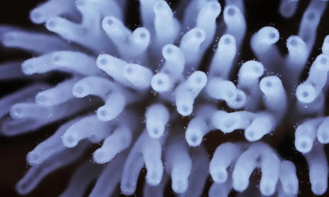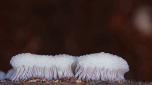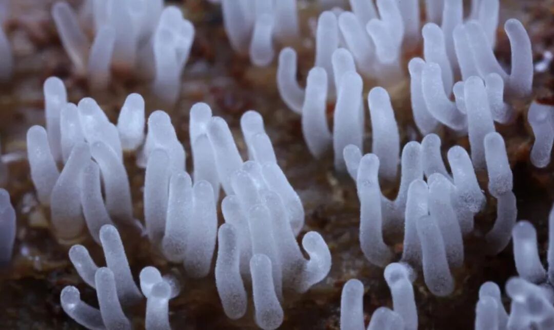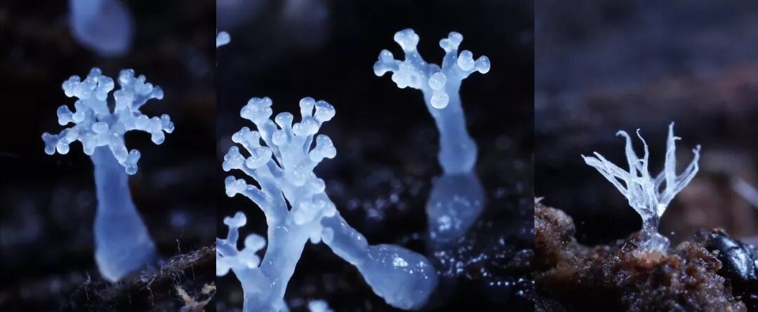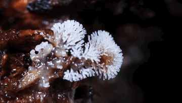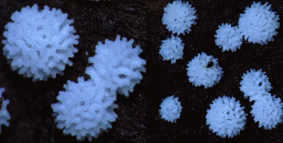 在视频里,首先出场的是鹅绒菌,它的子实体会慢慢长大、长高,然后会慢慢变干燥。中间有一个过程很像珊瑚,它干燥以后会传播孢子,孢子就在子实体的上面。
