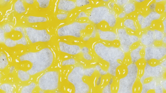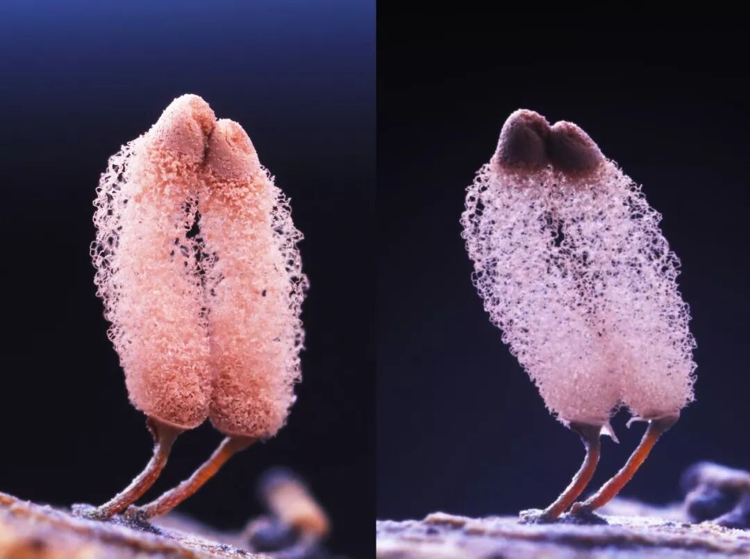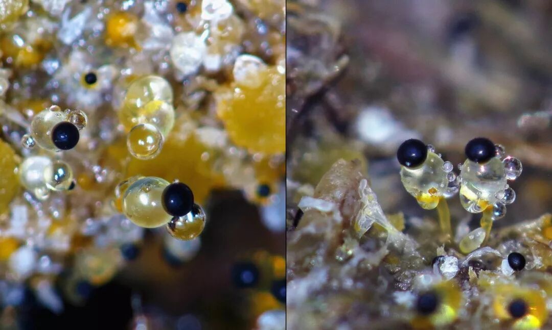 这是另外一组,长得很像咸蛋黄。弹出孢子后,透明的内包被会慢慢缩回去。左边这个水盈盈的,就是因为它不停地在吸水,然后有一些水渗透出来。
