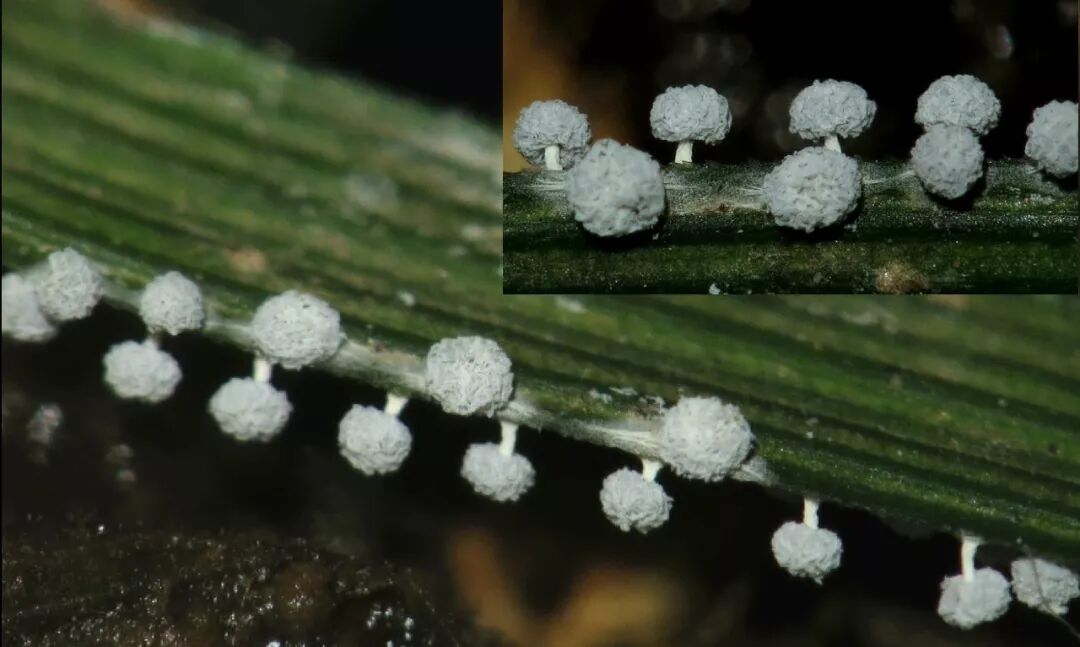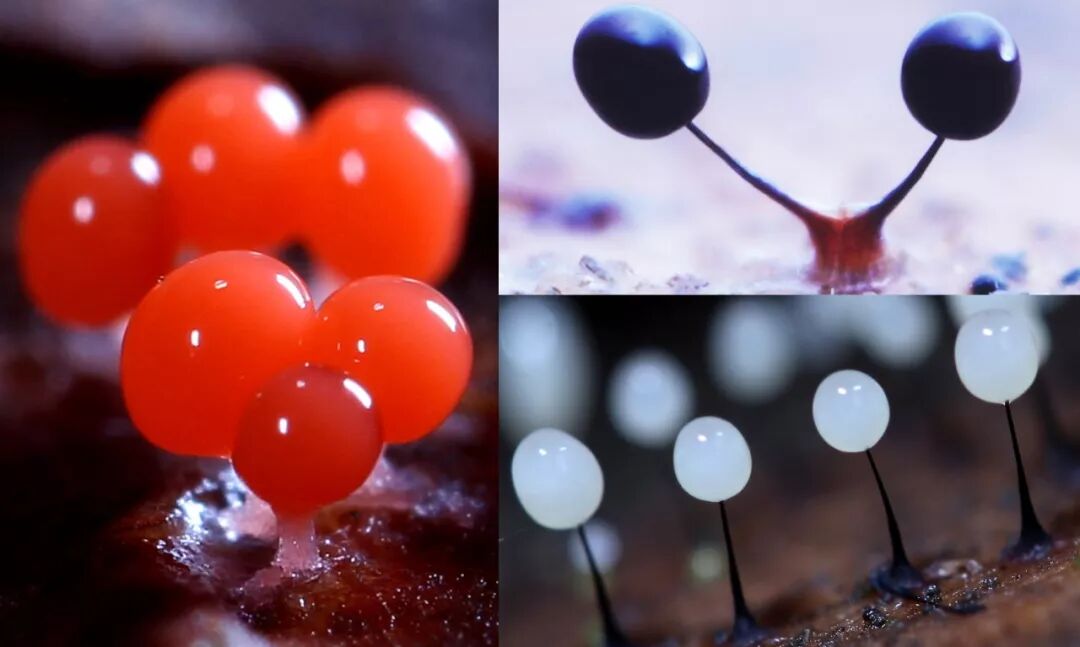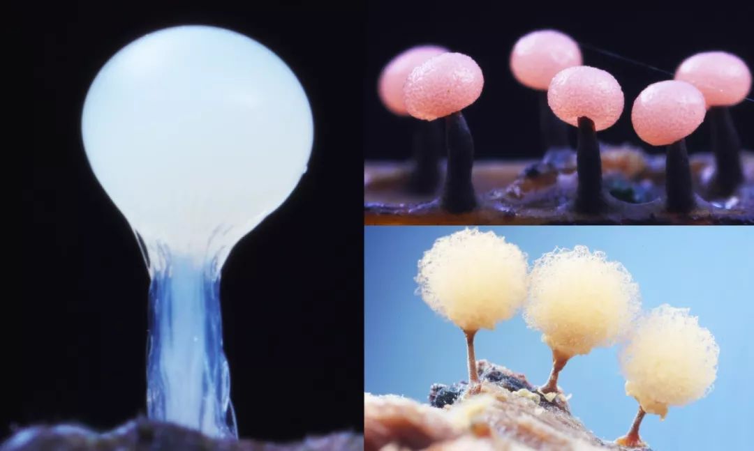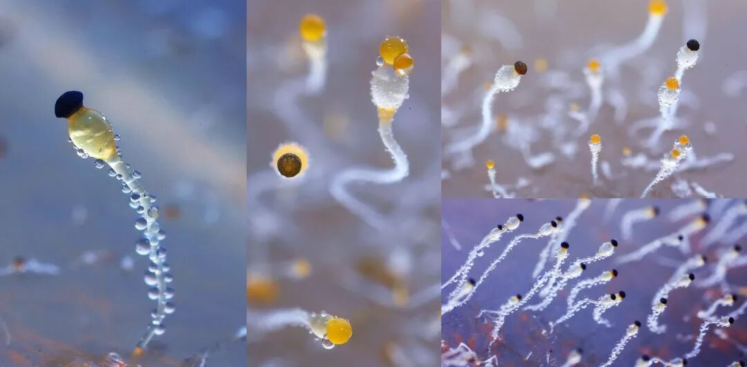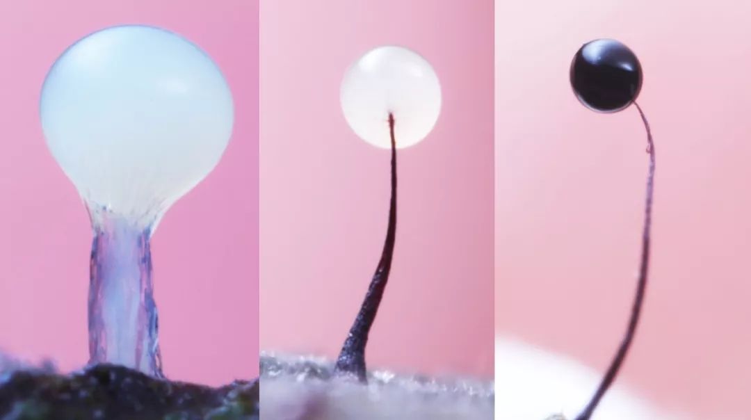 2016年的时候,我有天特别无聊,在网上闲逛,然后看到一个视频,讲述的是一种真菌叫水玉霉,它的孢子囊柄会慢慢长大,然后分化出像球一样的孢囊下泡,上面还有一点黑的是孢子囊。这个孢囊下泡会把孢子囊喷出去。