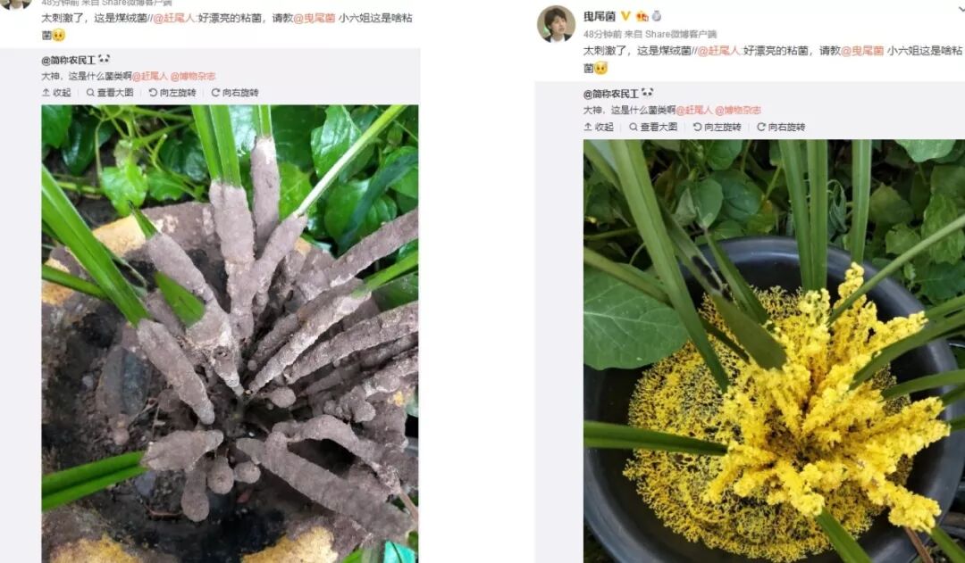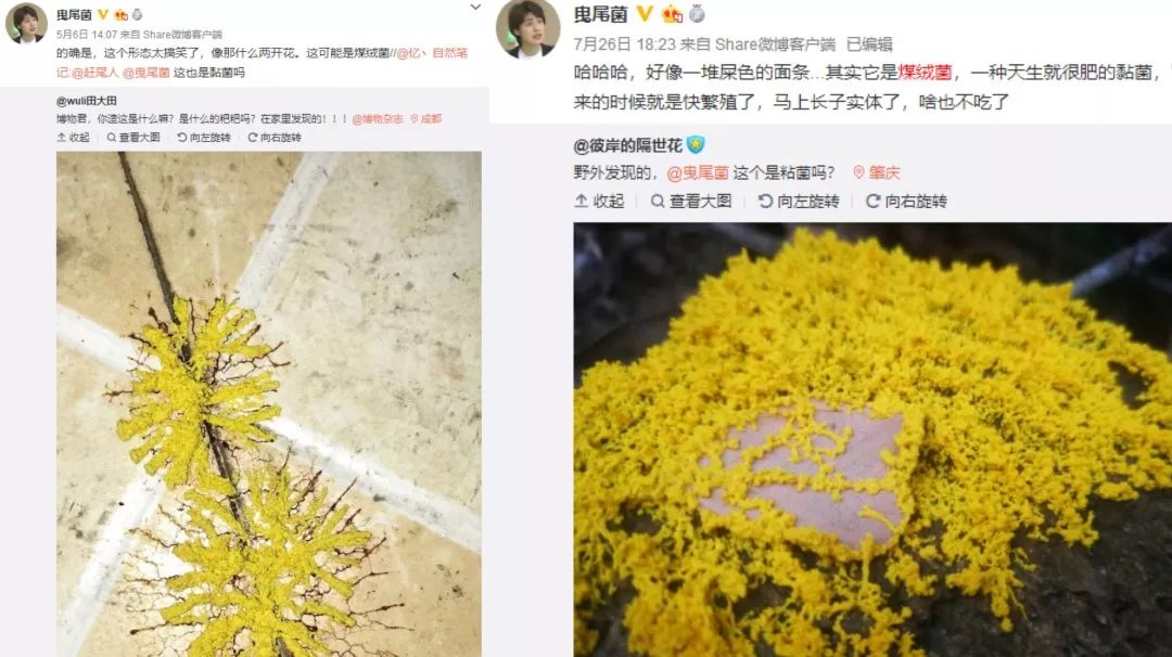 但是生活中最常见到的黏菌不怎么好看。这是最常见的黏菌之一,它叫煤绒菌。有很多网友在微博上@我,像左边这张照片就是一个网友家里的地板缝隙里长出了煤绒菌。它形态很丰富,长得像朵花一样。因为他家地板太潮湿了,底下可能没铺什么水泥,有很多土,就会长出来。还有一种形态就是旁边面条状的,这是另外一个网友问我的,它是从土里面冒出来的。