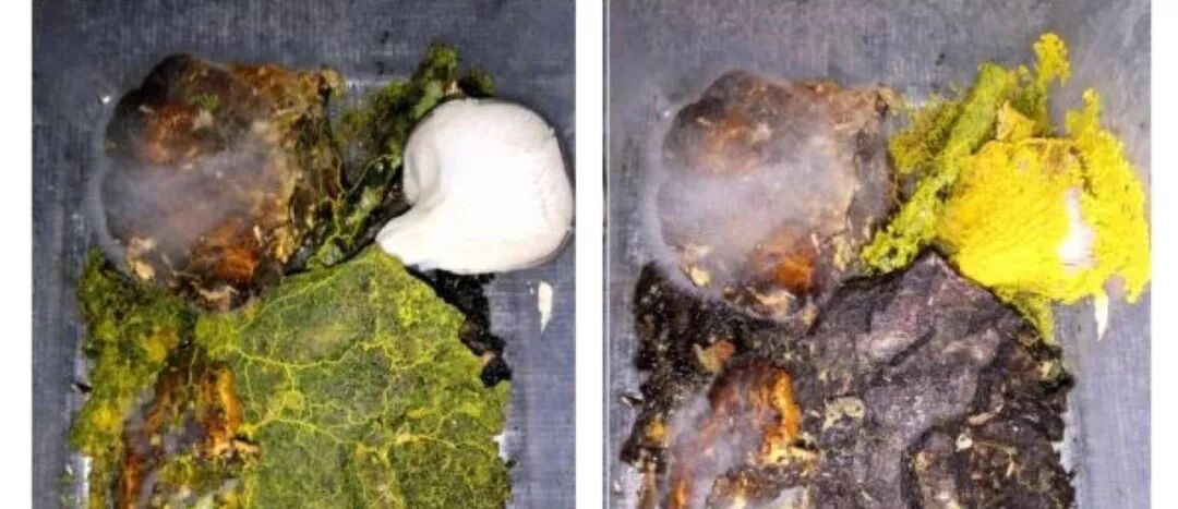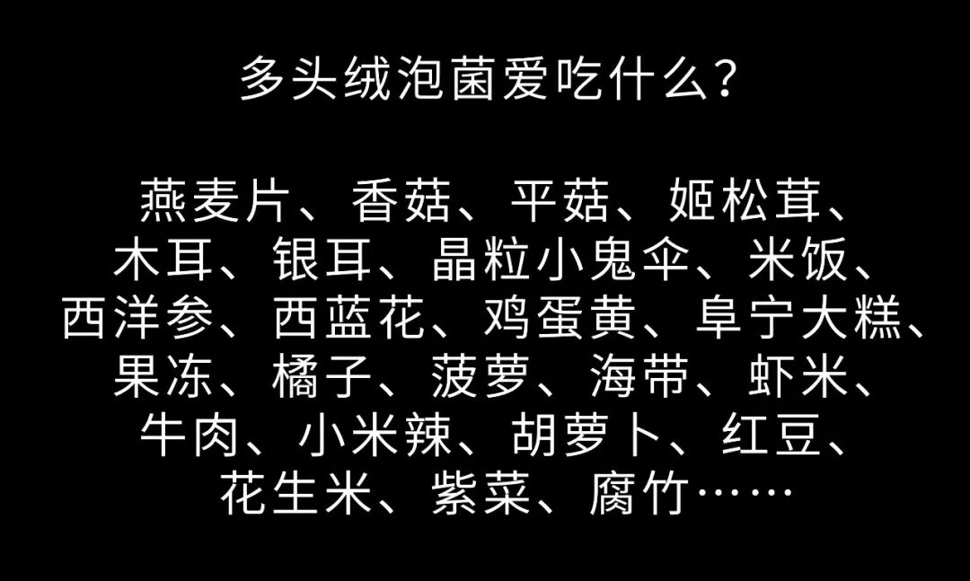 我就把它掰下来,然后给它拍了照片,直径大概是1.5毫米,跟它之前的内包被,就是那个球的直径差不多。 其实有很多菌可以在家里养,我最常养的就是多头绒泡菌,因为它最好养,它什么都爱吃,不挑食。我喂过它吃这么多种食物。不只是我喂的,有些是很多养多头绒泡菌的朋友们喂的。