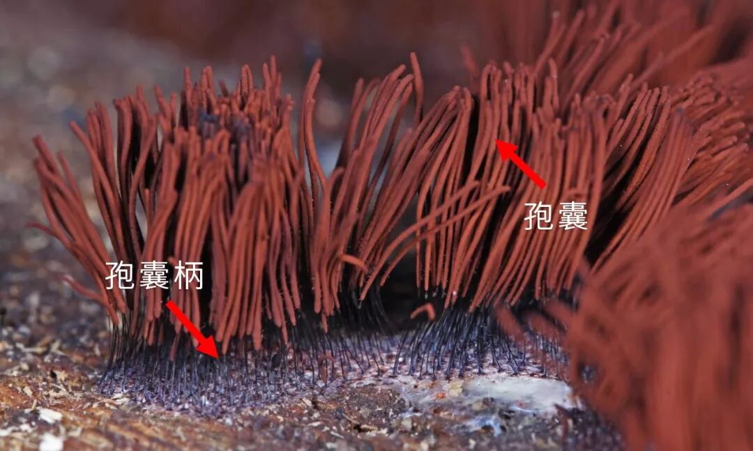 底下黑黑的就是它的孢囊柄,很像头发丝,它跟木头连接的地方很像头皮的毛囊。然后它的孢囊是棕色的,上面有很多孢子。