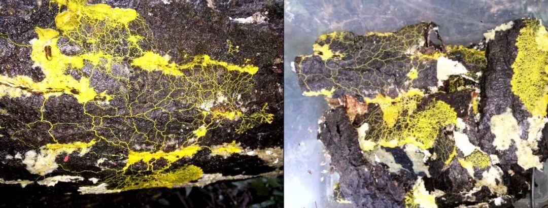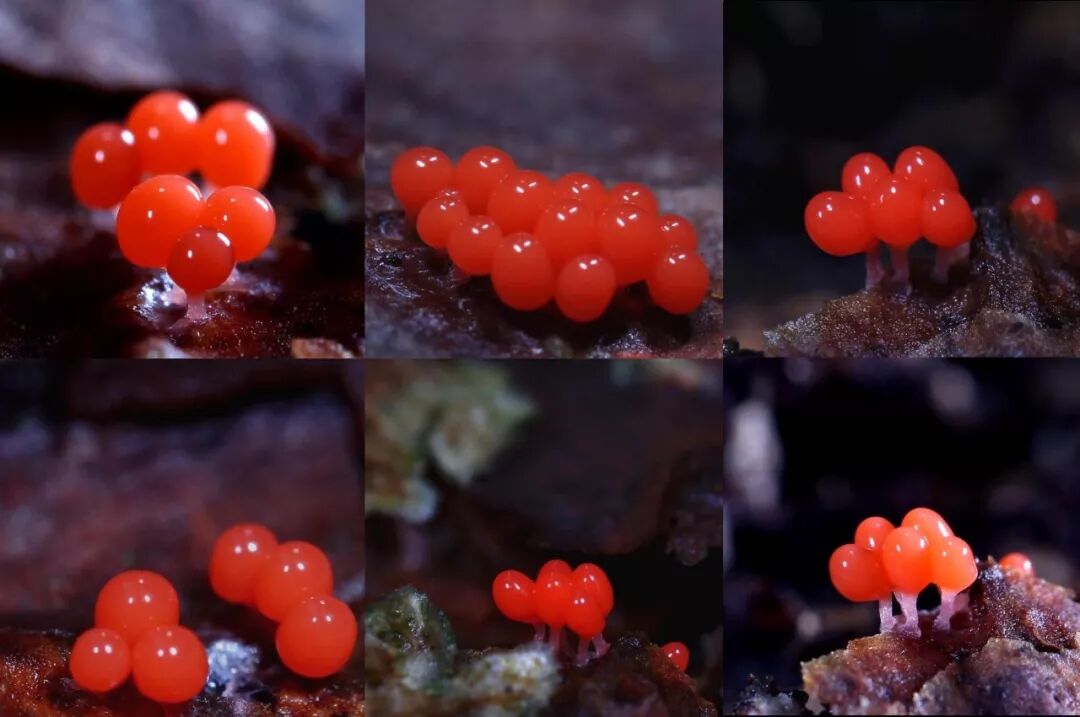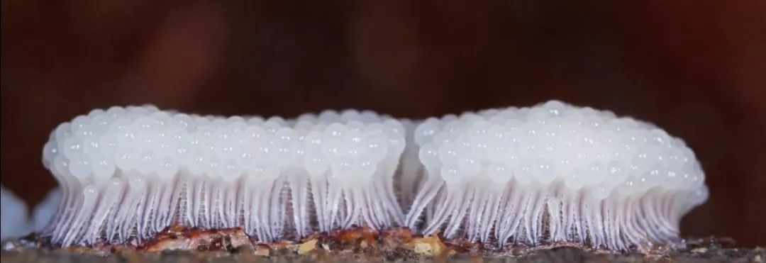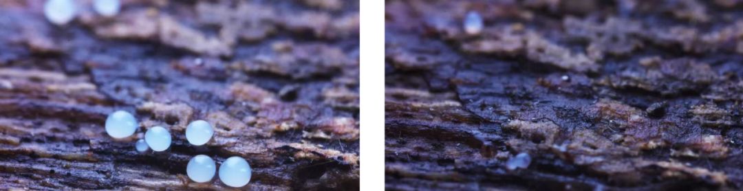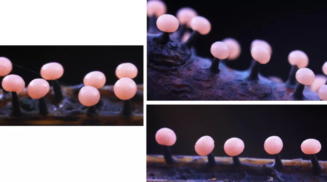 这种漂亮的黏菌就是从那儿找到的,它叫团网菌,这是当时我和两个好朋友去山里面玩,其中一个阿姨找到的。我一开始以为是虫卵,直到看到这里面有柄,我才发现它是一种菌,特别漂亮,可惜我后来就没有拍到过这样的了。