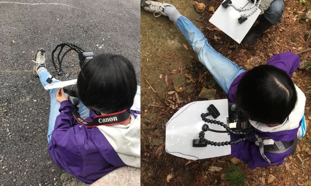 就是在野外拍的时候,我把它放在我的牛仔裤边上,就可以拍出那样的蓝色背景了,我还拍了很多很多的蓝色背景,还把腿借给别人拍。