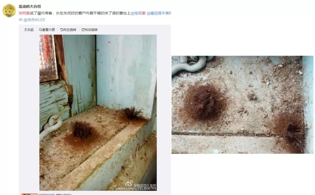 另外一种很常见的黏菌叫发网菌,它长得像头发丝一样。这是我一个好朋友家的窗台上长出来的,很常见。