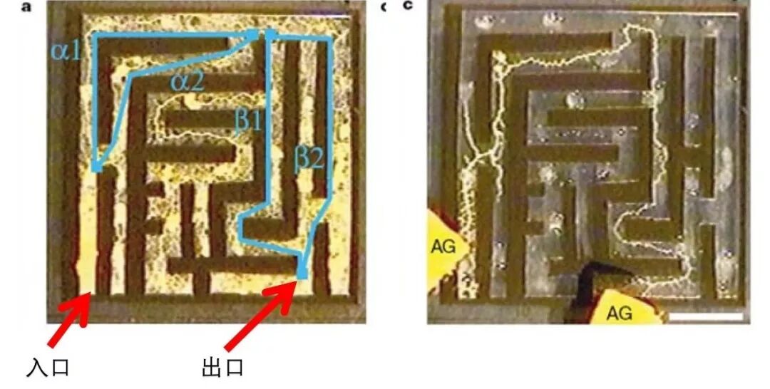 其实科学家特别喜欢研究多头绒泡菌,这是一个很著名的迷宫实验。大家肯定都听过,就是日本跟匈牙利的科学家把多头绒泡菌放在一个迷宫里面,然后它很快就布满了整个迷宫的通道。因为它有个特点,只要没死,它就会一直爬一直爬,爬遍所有湿润的地方。 接着,科学家在入口和出口的地方各放一块食物,结果很快,黏菌就扑向了食物,而且整个网络都消退了,只留下中间一条最短的线路连接食物,每一块它都不舍得扔下。