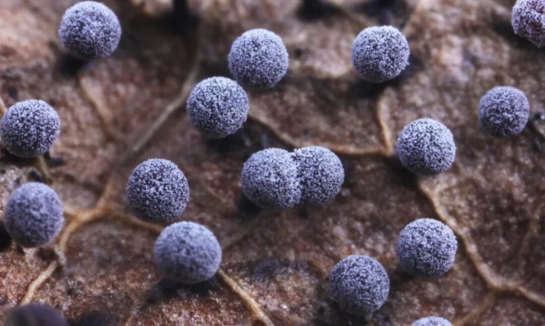 吃饱喝足以后它的原质团就会繁殖了,这是我拍的一小段多头绒泡菌繁殖的过程。它会慢慢分成一小块,然后很整齐地变成这种有结构的样子,然后孢囊就开始变黑,最后就慢慢地枯萎了,就像死了一样。但其实这个时候,它里面有很多孢子,还可以传播后代。