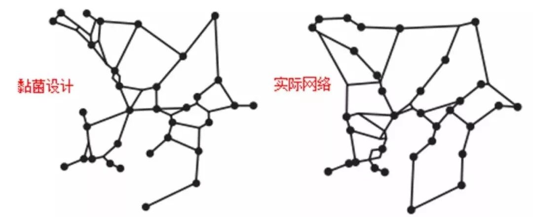 而且大家仔细看的话会发现,一开始那些很细小的网络,像B图里的,全部都消失了,只剩下F图里最后很精简的路线。 左边就是它最后设计的网络,右边是实际连接这36个地点的铁路网。有很多科普文章上说它们很像,但仔细看,我觉得其实并不像,因为这36个点都是固定的。事实上,科学家做了大量的重复实验,每次的结果都不一样,黏菌走出了很多种网络。