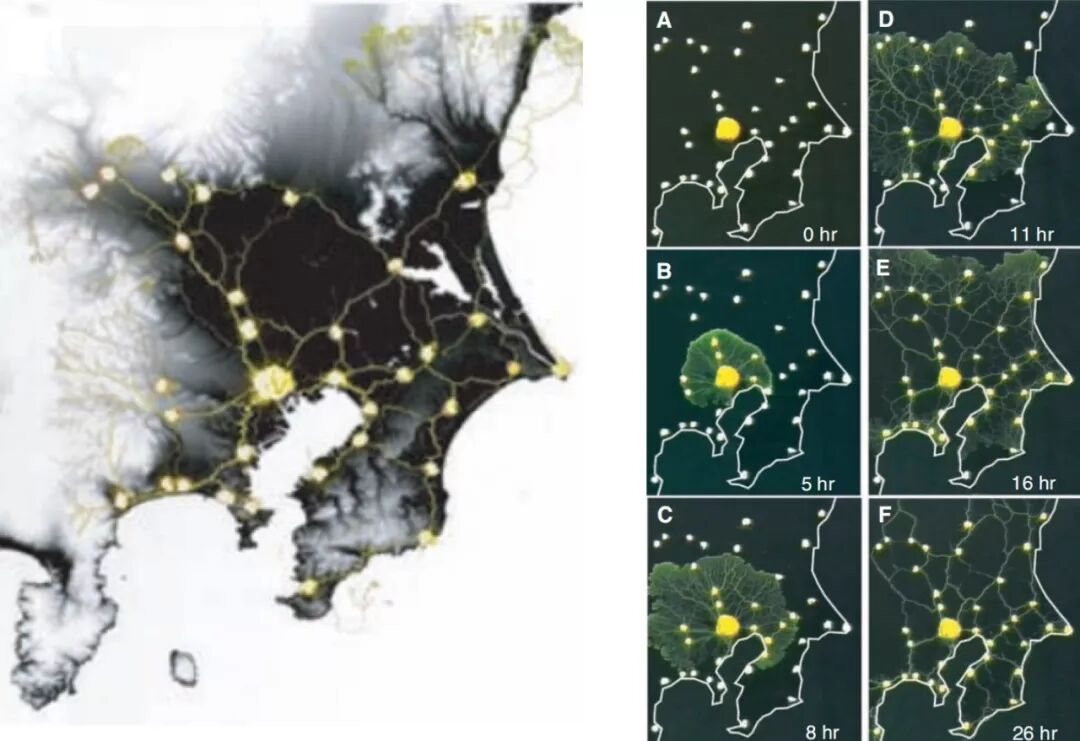 科学家就发现了黏菌它有这么个本事,它会用最短的路径来连接食物。所以后来科学家就想看一下,如果多放几个点,它还能不能以最短的路径连接所有食物。于是他们就做了另一个实验。 他们设计了一个培养盒子,盒子内模拟了日本关东地区的地形,在36个关键地点,分别放上了燕麦片,然后在代表东京的那个地方放上了一块最大的燕麦片。26个小时之后,黏菌就连接好了所有的点。