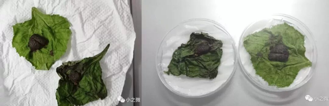 其实我开始的时候没有看到它,因为它特别小嘛,又是黑白的,不显眼,我当时是在拍这种黄色的盘菌,当拍完照片再放大的时候才看到原来边上就是水玉霉,就像看到了听说过很久的外星人一样。 大家猜它长在什么东西上?它其实是长在牛粪上面,它是粪生真菌,而且它只在草食性动物的粪便上生长,比如马、牛、羊。我当时不会养菌,所以就没采标本。但是去年,我的一个好朋友他在野外看到了水玉霉,然后他就赶紧用草叶子包下来寄给我了。大家可以看到这一坨牛粪上一点点白色的东西,就是水玉霉。我一收到就用培养皿继续培养它。