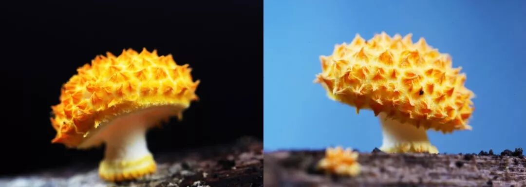 这是一种小蘑菇,叫粗糙金褴伞,长得很像菠萝包。右边这个蓝色的背景,大家猜我是怎么拍的?