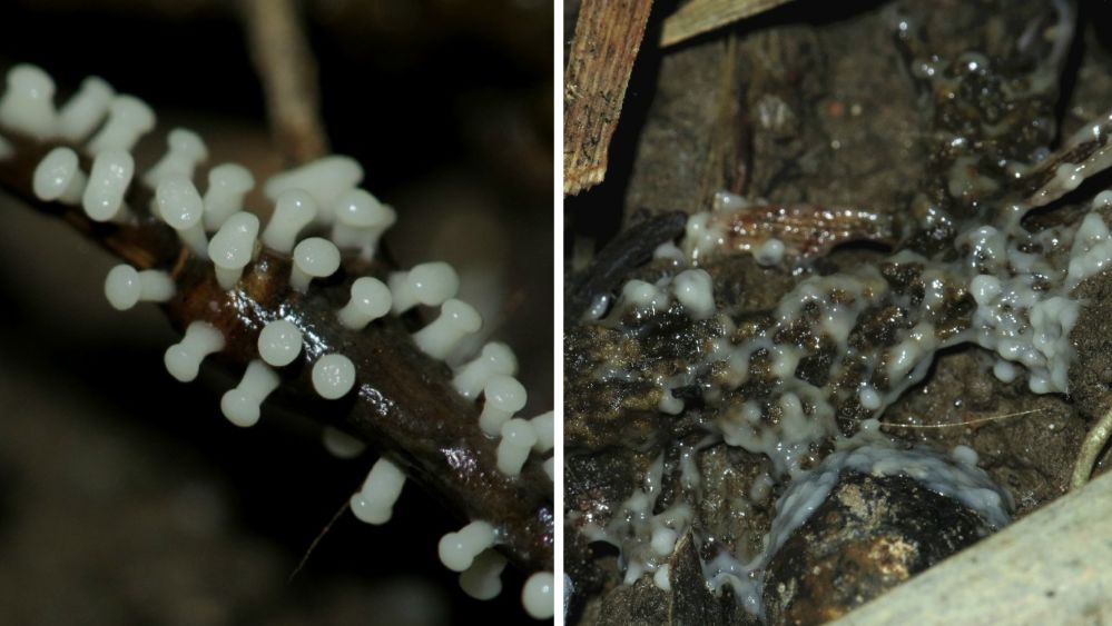然后我就蹲下来继续找它其他的形态,左边有点透明的是它未成熟的样子。继续找,又看到了右边这种像鼻涕一样的,是它的原质团,就是它爬来爬去的那个生命阶段。
