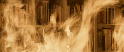 比如,电影开头的熊熊烈火、燃烧的书架和书桌…