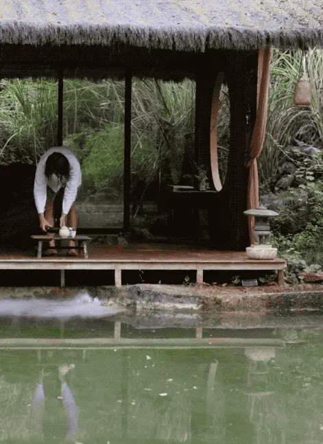 我还在水边装了造雾器,有时候水面上飘着薄薄的雾气,就像仙境一样。茶寮旁边我引了一股山泉水,平时泡茶、洗杯子都是用这个水。茶叶渣我也直接倒回池塘里,一点都不浪费。