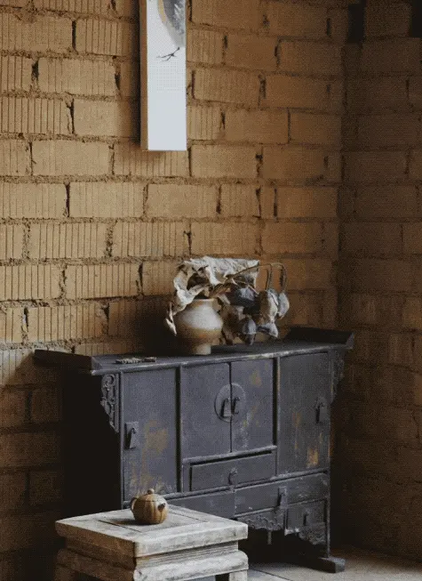 推门而入,首先能看到一个老条案做的玄关,我在玄关上放了一个南北朝时期的佛造像标本,还有一件南北朝的陶碗,老的佛龛。在玄关后面,我种的一片竹林,我特别喜欢竹子,这种线条挺拔,能把整个园子的空间支撑起来,但是又很通透,很俊秀,跟这一组山峰也比较呼应,其中有一棵是我故意斜着种的,很有趣。