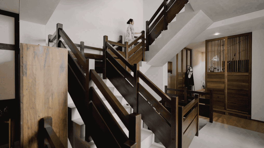 家中处处细节夫妻俩都花了心思:简单的楼梯形态加上木质护栏,公共空间之间用木质屏风代替墙,别有一番风味