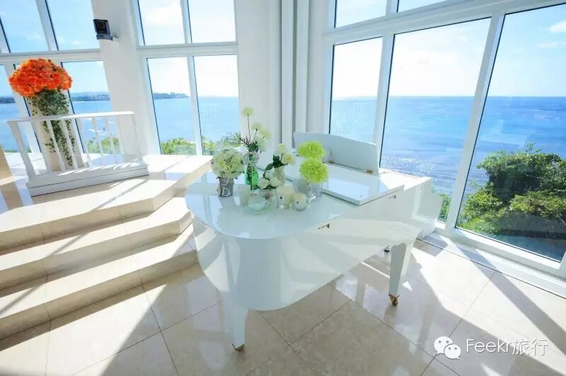 教堂有近2000粒大大小小的施华洛世奇水晶从天花板垂下来,在阳光与海水的折射下,令教堂内不断闪耀着不同的耀眼的光芒。而白色钢琴,白色横椅,白色顶梁柱,白色的花灯,白色屋顶,给人圣洁的感觉。透明的落地玻璃与窗外的碧蓝海景相互映衬,氛围极其曼妙,浪漫得不可言说。