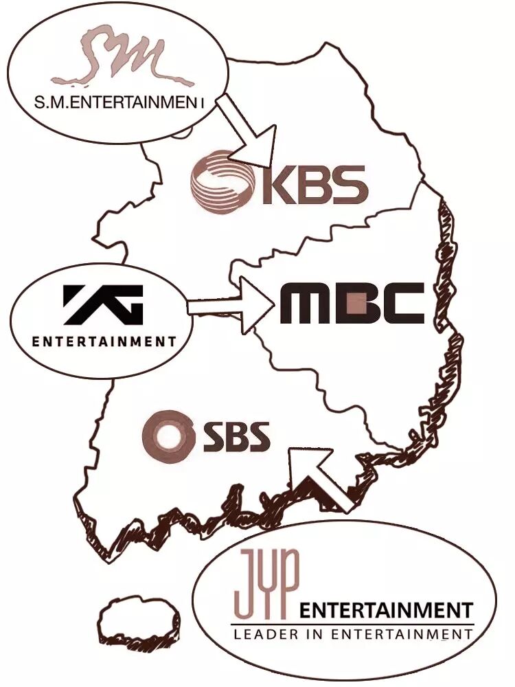 与中国娱乐市场“百花齐放”且价格“百里不同风”的局面不同,韩国娱乐市场可谓“三分天下”:KBS、MBC、SBS三大电视台上演“三国争霸”管控节目播出;SM、JYP、YG三大经纪公司源源不断地输出艺人。因此,在激烈的竞争之下,只有专业艺人和好作品才可以占领市场,所以电视台和电视从业者就会不断创新,不断推出新的作品。