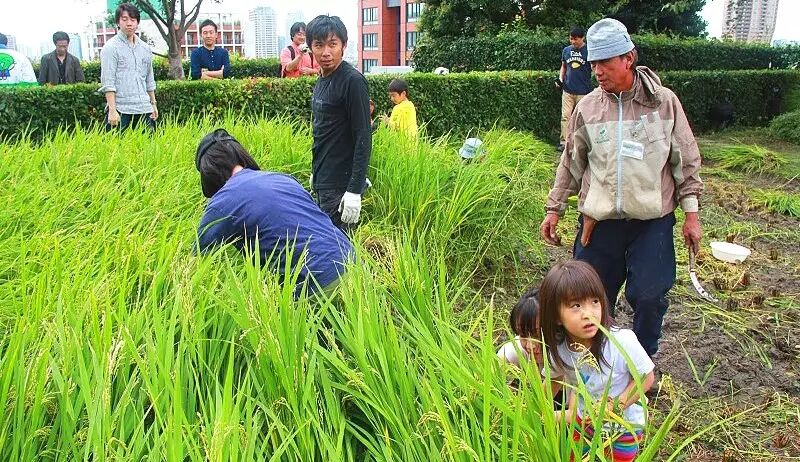 生活在东京市中心的小朋友以前几乎没有机会接触到农业,所以赤脚走进稻田,是很好的体验。秋收时,他们可以收到自己劳动的成果,东京人称之为“食育”。
