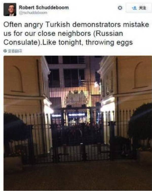 被俄罗斯人砸了大使馆的土耳其人很愤怒,决定以牙还牙,然后……然后,荷兰总领事哭着发了推特:土耳其示威者错把我们当成邻居俄罗斯领事馆了……正在扔鸡蛋!我们是隔壁的荷兰,不是隔壁的老王!%>_<%