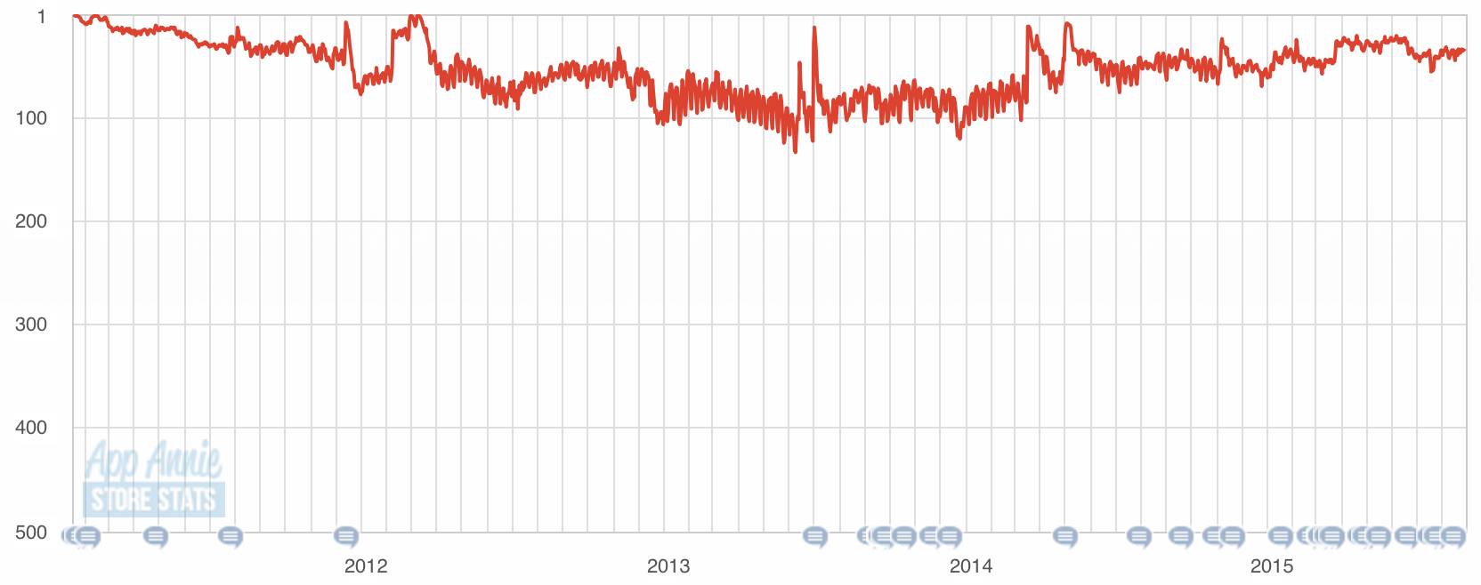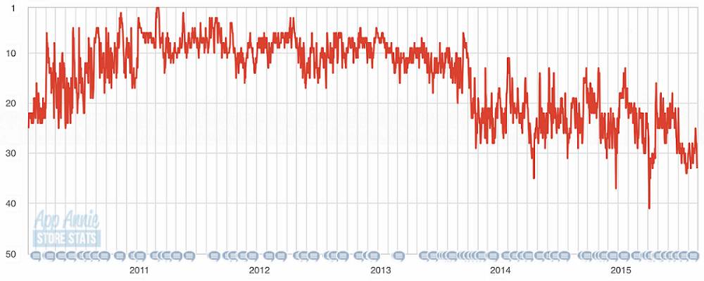 ▲ Evernote在苹果APP Store2011至2015年排名。数据来源:APP Annie