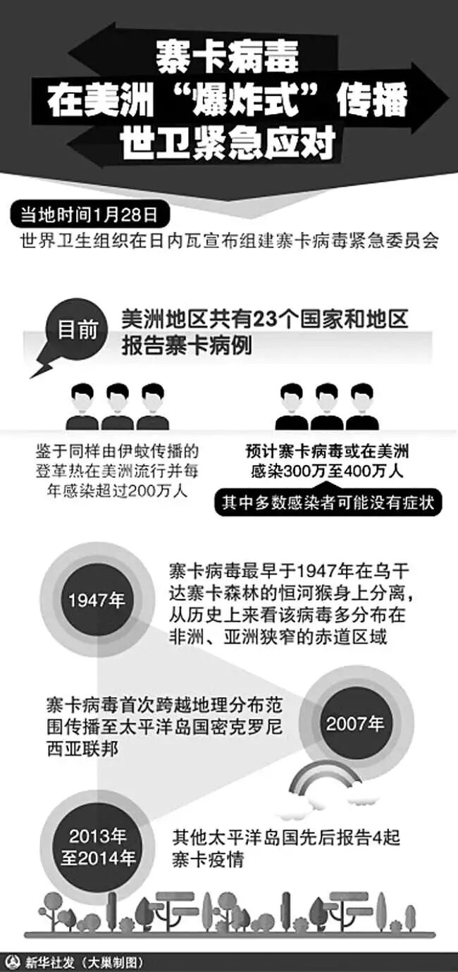 寨卡病毒于1947年在非洲乌干达寨卡森林中的猕猴体内分离出来。由于过去感染人类的病例极少,直到2007年在西太平洋的密克罗尼西亚联邦爆发群聚疫情才获得较多关注。目前寨卡病毒传染活跃的疫区,主要集中在中南美洲和加勒比海各国。但预估未来一年,整个美洲国家疫区的感染人数会有300~400万人。