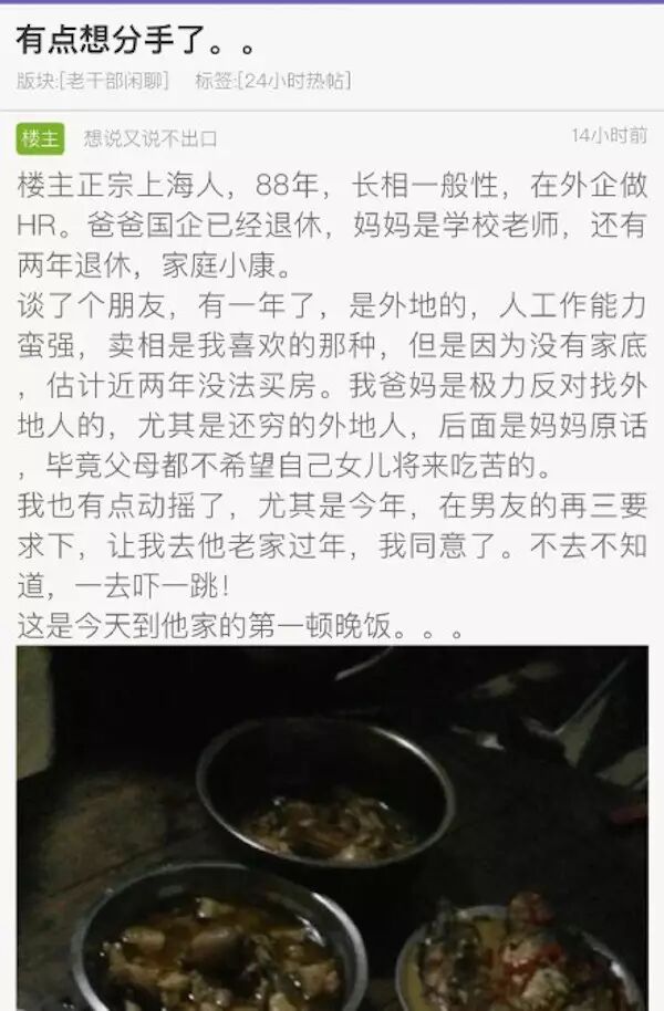 春节刚开始,一位上海女孩网上贴出男友江西老家年夜饭照片,并声称想分手。
