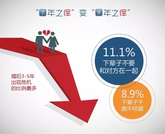 据《2015年中国人婚恋调查报告》显示,在婚姻生活中,“七年之痒”已经变成“五年之痒”,婚后3-5年出现危机的比例最多。婚龄3-5年的调查者中有11.1%的人表示下辈子不要和对方在一起了,另外更有8.9%的人决定下辈子干脆不结婚。