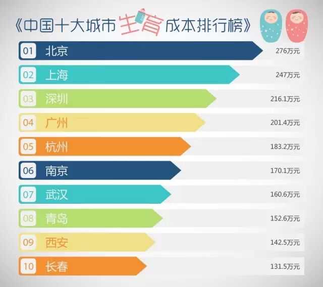 当你成为“孩奴”,还需负担一笔苦甜掺半的糊涂账。据《中国十大城市生育成本排行榜》的不完全统计,北京养育一个孩子到成人的成本最高达276万;上海 247万元次之。但这里仅统计了怀孕、产后养子、基本教育经费、生活费用等9项内容,如果还要海外留学,那至少还要增加上百万的成本。