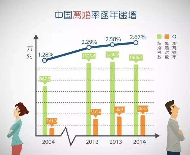 据民政部最新数据显示,2014年全国依法办理离婚登记363.7万对,比上年增长3.9%,自2003年以来,我国离婚率已连续12年逐年递增,从2004年的1.28%递增至2014年的2.67%。