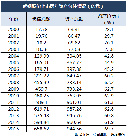 负债总额和负债率均刷新武钢股份的历史纪录。截至2015年底,武钢股份总负债658.62亿元,资产负债率达69.7%。