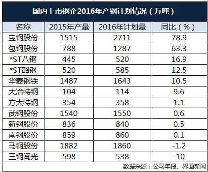 钢铁产量不减反增并非武钢独有。截至发稿时,共有12家上市钢企发布今年的产钢计划,仅三钢闽光(002110.SZ)和马钢股份(600808.SH)有所减产,方大特钢(600507.SH)、新钢股份(600782.SH)、南钢股份(600282.SH)产量与去年基本持平,其余六家均有不同程度的增产。宝钢股份(600019.SH)增产近八成居首,业内分析认为,新投产的湛江项目产量或计算在内。包钢股份(600010.SH)增产亦超六成。