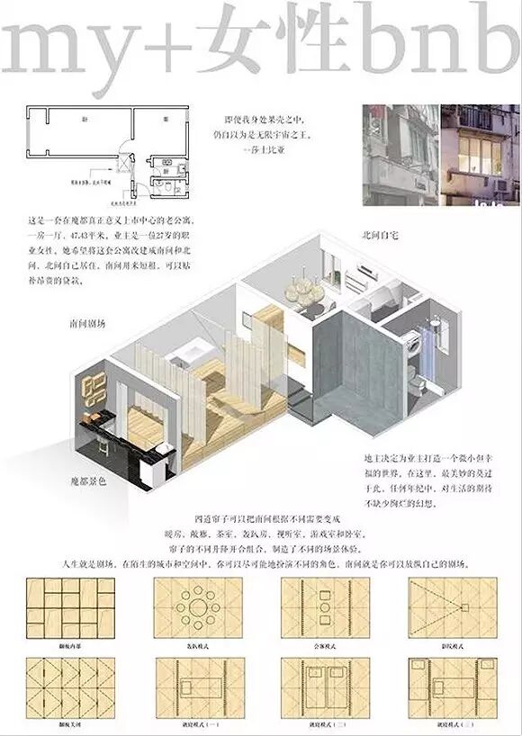 她将稍大的房间用作出租,采用榻榻米设计,还配有电影播放器,将白色的幕布拉下,房间便成为了临时电影院。房间阳台拥有一面“绿墙”,绿墙的下部放置了一个迷你洗衣机,供住客专用。