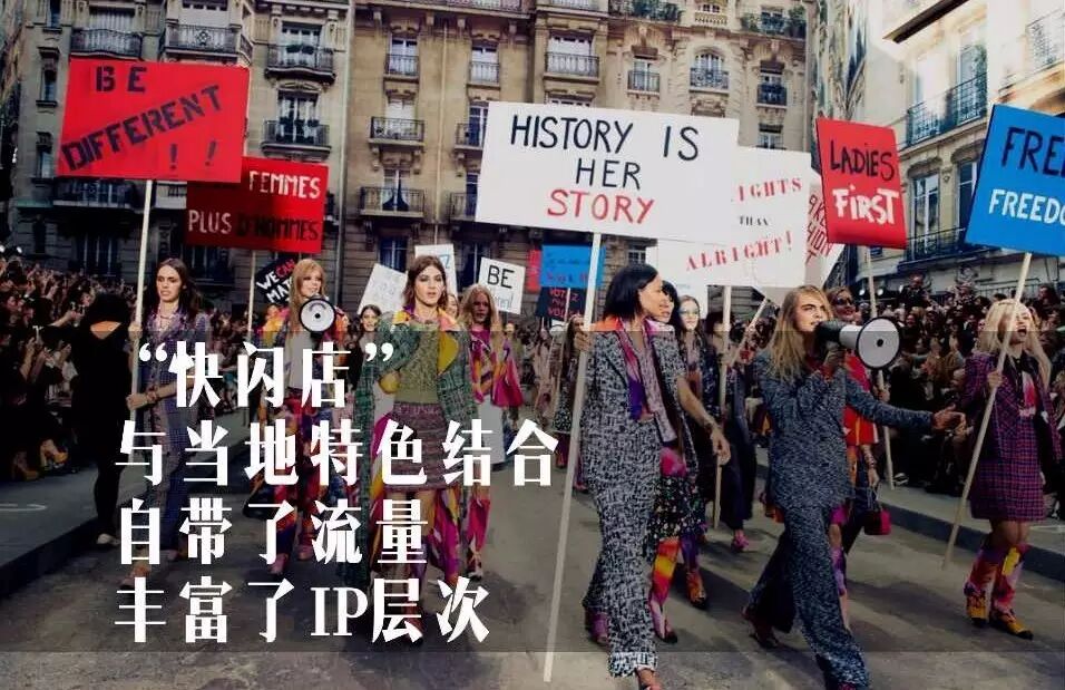 Chanel就很热衷于“快闪”,它的秀场往往出其不意地将巴黎大皇宫改造为赌场、酒馆、超市、农庄、航站楼或者大街。模特光鲜地在大街上喊出女权口号,让女权主义变得轻快而“好看”;穿着亮丽的模特在农庄里游荡让高端定制变得亲切而柔和……