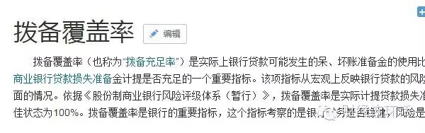 最近大家都在非常牛逼的谈论类似于 “银监会动态调整拨备覆盖率”、“中国7家银行或将被下调拨备覆盖率”巴拉巴拉……好吧你一定注意到其中一个高频,然而你却并不太容易懂的名词。对!就是【拨备覆盖率】。