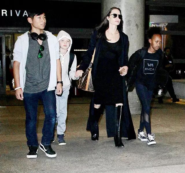 当地时间2016年3月2日,美国洛杉矶,安吉丽娜·朱莉一身黑衣与儿女们现身机场。