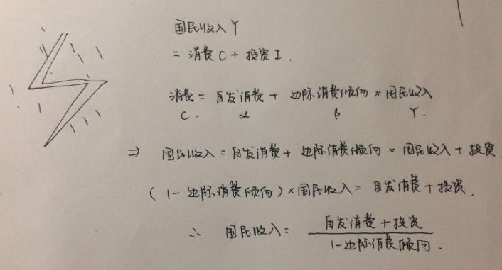 拆开来看,投资I的系数为1/1-边际消费倾向),所以每增加一单位的投资,就会增加1/1-边际消费倾向)单位的国民收入。
