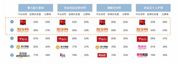 最受好评的电商平台但当被问及知名度和购物频率时,阿里巴巴旗下的天猫和淘宝却在各个品类都获得了最高的品牌知名度和渗透率。