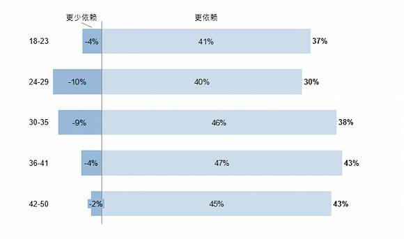 不同年龄组别未来六个月对网上购买快消品的依赖性便捷的购物体验是推动消费者在线上购买快消品的主要原因。OC&C Strategy Consultants大中华区合伙人庄淳杰指出:“在全国各地的基础设施与物流产业都在快速发展时,不管是商品在境内的流动量,还是‘最后一公里’的服务素质都得到大幅的提升,满足了消费者对随时随地在网上购买快速消费品的需求。”