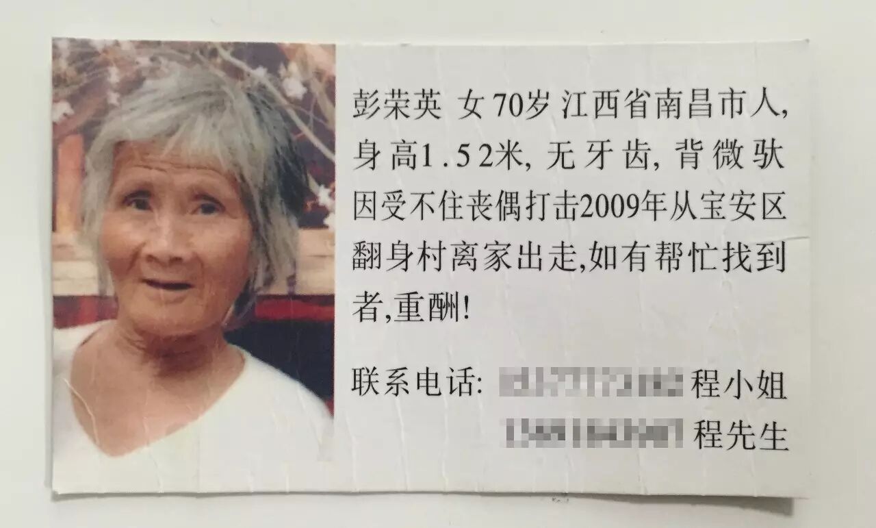 根据之前的经验,除了救助站和精神病院,走失老人最大的可能就是在户外流浪。兄妹四个将母亲的照片印成小卡片,分头向巡警、环卫工人、乞丐和流浪汉派发,寻找线索。那时候彭荣英63岁,头发几乎全白,背微驼,没有牙齿,外形较易辨认。
