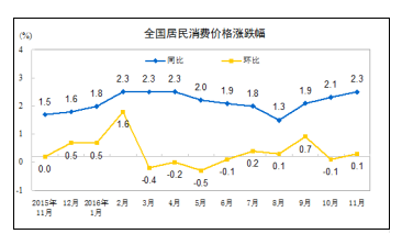 12月9日消息,中国11月CPI同比2.3%,创今年4月来最高,预期2.2%,前值2.1%;中国11月PPI同比3.3%,创2011年10月以来最大,预期2.3%,前值1.2%。(国家统计局网站)
