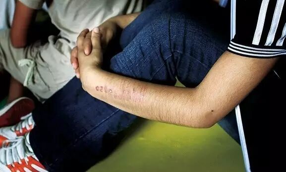 图(翁洹)| 广东惠州救助站里的维族流浪儿,手臂上满是烟头烫伤与刀片割伤的痕迹。