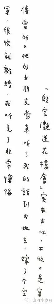 在许多当红网文里,有人说成家榴为了傅雷从此终身不嫁。这当然是夸张。事实上,张爱玲写了殷宝滟送花楼会之后,因为故事和真人真事的符合度太高,成家榴便吓得遁走内地,嫁给一个空军,这一点张爱玲在后记里写得明明白白: